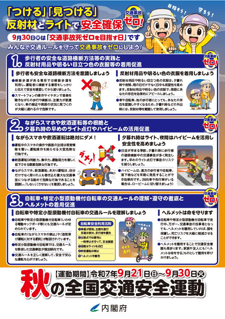 令和7年秋の全国交通安全運動が、9月21日(日)から30日(火)までの10日間実施されます。特に最終日の9月30日は「交通事故死ゼロを目指す日」です。